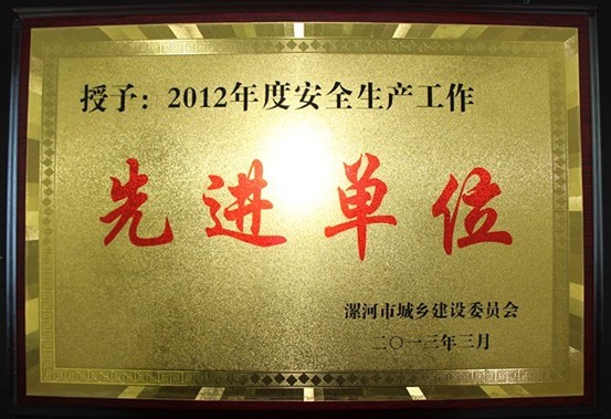 漯河公司訊 在4月12日召開的漯河市建委2013年安全生產工作會議上,漯河公司被授予了“2012年度安全生產工作先進單位”榮譽,鞏德剛、蔡永康、雷豐被授予了“2012年度安全生產先進工作者”榮譽。