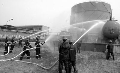 在指揮部的統(tǒng)一指揮下,警戒組、技術組、滅火組、鋼瓶轉(zhuǎn)移組高速運轉(zhuǎn)起來,水帶連接、滅火器到位……一切都在緊張有序地進行著,兩條銀色的“水蛇”也急不可待地向罐體的泄漏處飛射而去。