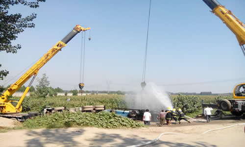 在漯河市應急辦的組織下,由郾城區政府、交警、燃氣、消防、交通、環保、安監、技術監督局等相關部門參與的臨時救援小組開始展開救援。為減少救援期間操作不當給事故車輛造成更嚴重的后果,郭總在救援方案中提出了如下建議并通過了救援小組的一致認可和認真落實:一、用沙土對事故車輛側翻時造成的柴油泄漏進行掩蓋,防止明火造成燃燒;二、對槽車車體做更詳細的檢查,防止在吊車起吊時,薄弱環節發生斷裂造成天然氣泄漏;三、對事發路段進行平整,防止吊車側翻,砸壓液化天然氣槽車;四、在起吊以前,關閉車體所有儀表的閥門,防止燃氣泄漏;五、在起吊過程中,消防人員用水槍對準起吊的鋼絲繩進行沖水,防止起吊的過程中產生火花;六、在起吊過程中,其他人員撤離安全區域以外。