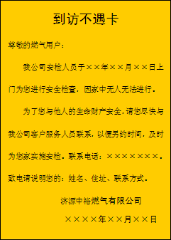 該貼原文為:“下班回家,見門上有一張與其他彩頁廣告不一樣的紙牌,看后方知是濟源中裕燃氣公司的安檢人員特意留下的到訪不遇卡。卡的大致內容是尊敬的天然氣用戶,我公司安檢人員于某時間到您家中進行安全檢查,因家中無人無法進行。為了您和他人的生命財產安全,請您盡快與我公司客戶中心聯系,以便另約時間。聯系電話……小小一片卡,反映出一個行業的工作作風,小小一片卡,大大拉近了供求之間的距離,小小一片卡,異常暖人心。”